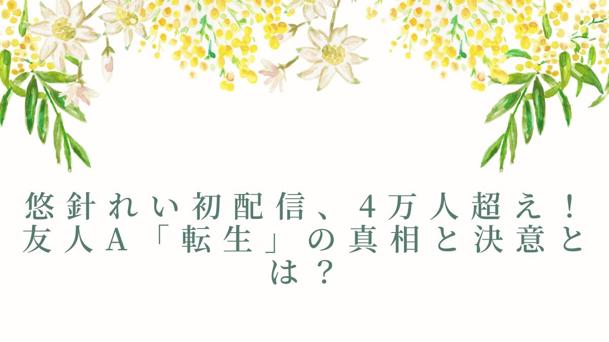 悠針れいさんの初配信、私も全力で応援します!皆さんもぜひ一緒に見守りましょうね!これからも悠針れいさんの最新情報を追いかけて、皆さんにお届けしていきますので、お楽しみに😊✨